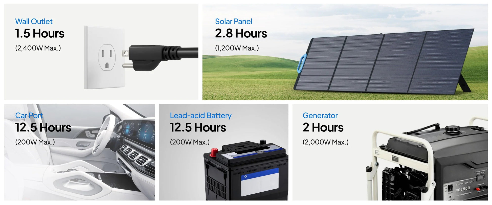 - Panel(es) solar(es) (1.200 W): ≈2,5 horas