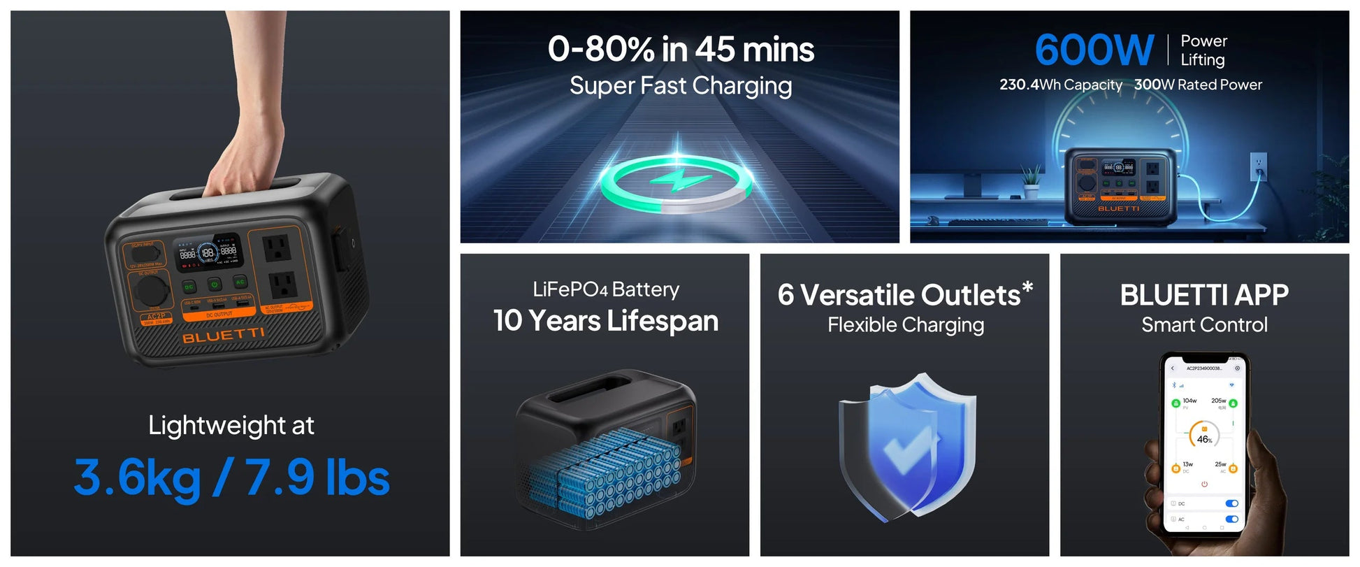 - Pequeño pero poderoso: Ofrece una salida de CA de 300 W y una potencia de elevación de 600 W, respaldada por una batería de 230,4 Wh de capacidad para una mayor duración.