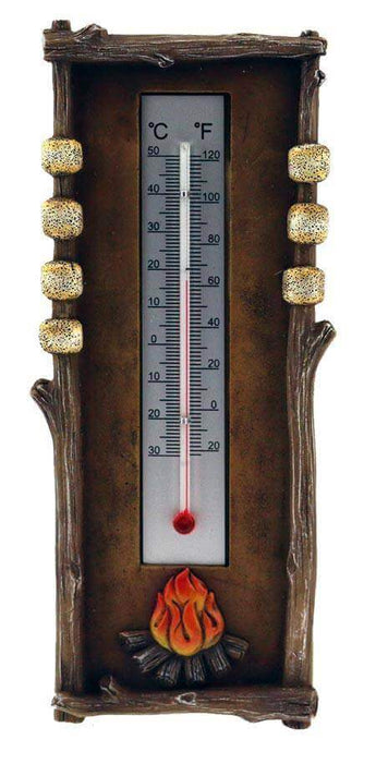 Thermomètre avec scène de feu de camp. Pour l'intérieur (fixation murale au dos). Polystone 3 "x8". Thermomètre de feu de camp