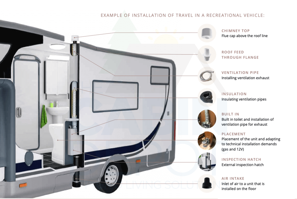 - Exigence : un accès adéquat à une alimentation électrique 12 V, au gaz GPL et un acheminement correct du tuyau d'échappement au-delà du toit sont essentiels.