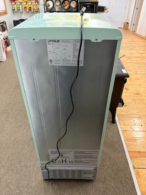 The 8 cu. ft. Classic Retro by Unique single door refrigerator with built-in freezer transports you back to the '50s with its iconic retro design and chrome-finished accents. Finished in a stunning Summer Mint Green, this refrigerator serves as the perfect conversation piece for your cabin, cottage, or bar.